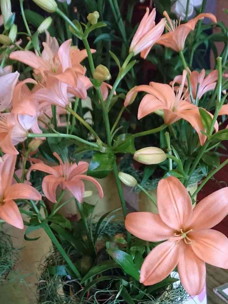 スカシユリとの交配種で、上を向いて咲き、香りがありません。オレンジ色や真紅などの濃い色合いが多い中、優しいオレンジ色が目を引きました‼🤗🎵