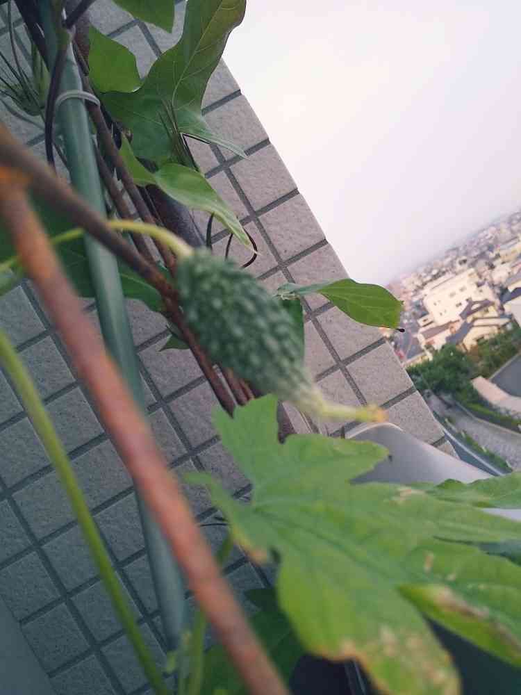 去年スーパーゴーヤの苗を二つ買ってきて、バルコニーで育てました。日当たりの良くない位置にもかかわらず、けっこう収穫できて、美味しくいただきました。その種を冷蔵庫で保管して春に蒔いたら、今年も結実!日当たりが良いようにバルコニーの手すりにはわせました。まだ小さいですが、8階からの眺めを楽しんでるようです。