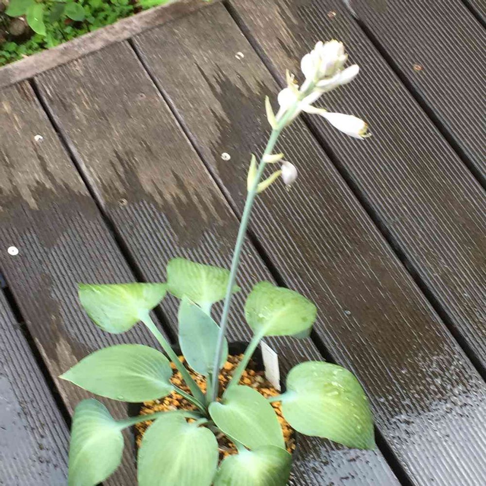 ホスタ「ハルシオン」が咲き始めました。ネット(四国ガーデン)で5種見はからいで購入したうちの3つ目。葉はスモーキーな銀葉で花は白に紫がかったグレーが混じっている感じです。(写真下手で花にピントが合わない😅)