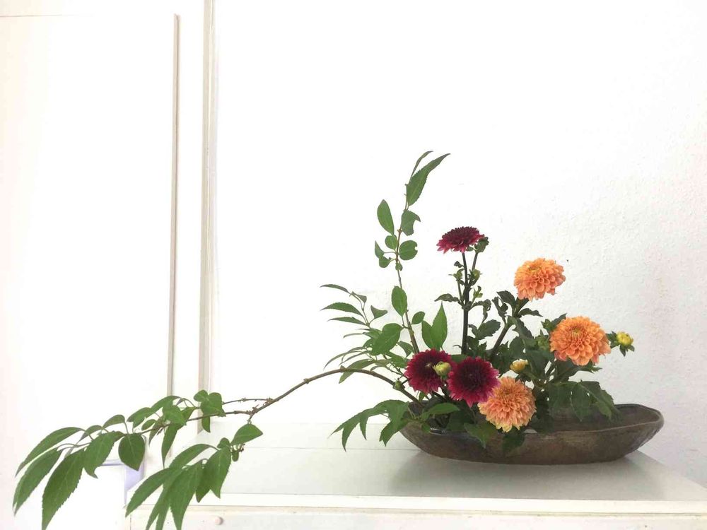 レンギョウとダリア2種で生けました。写真にすると主枝であるレンギョウがとても長く見えてしまいます。