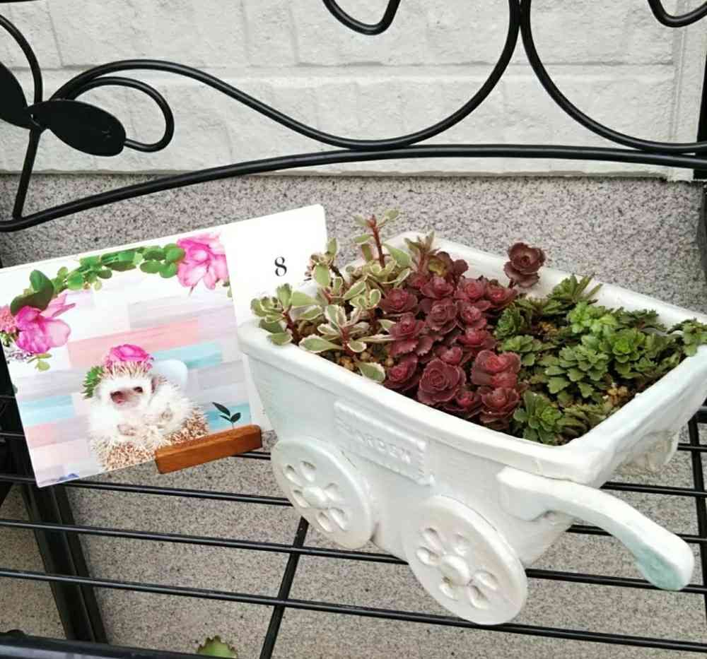 6月の陶芸教室で作った手押し車プランターに大好きなセダムを3種盛り🌿🌱😆