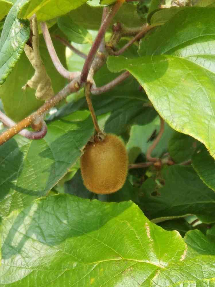 キウイフルーツが1つだけ実がついていました🥝 雌株しか(私が雄株抜いたから…)ないのに〜どこのお家の雄株と結婚したんだろ😅