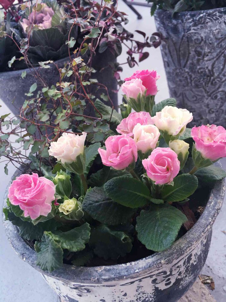 やっと可愛いプリムラがお店に並ぶようになってきたので。。ベランダはやっぱりピンクのプレミアム薔薇咲きジュリアン いちごのミルフィーユ💕