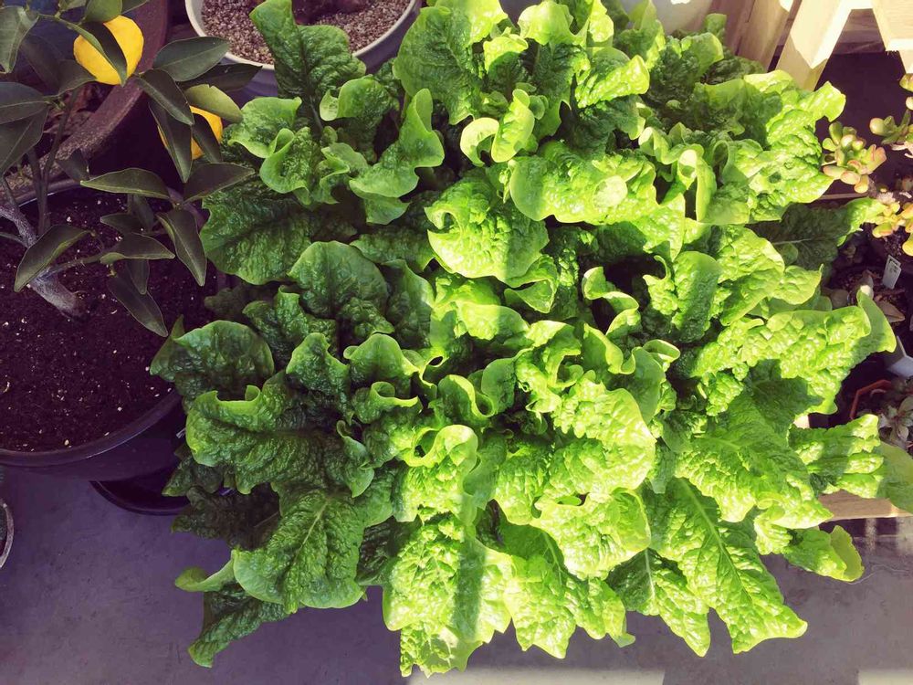 プランターが見えないほど茂ったサンチュ、寒くても異常に元気です。そろそろ焼肉かな。
