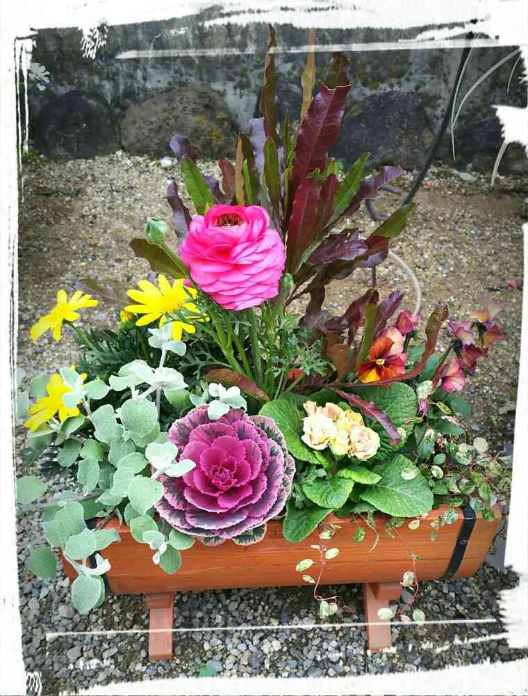 ラナンキュラスと葉牡丹を中心とした寄せ植え🌹by お店のスタッフさん🎵