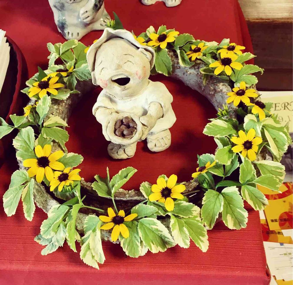 周りを陶器のドーナツ型の花器にとっても素敵にお花がアレンジしてあってなんとも素敵😍💕