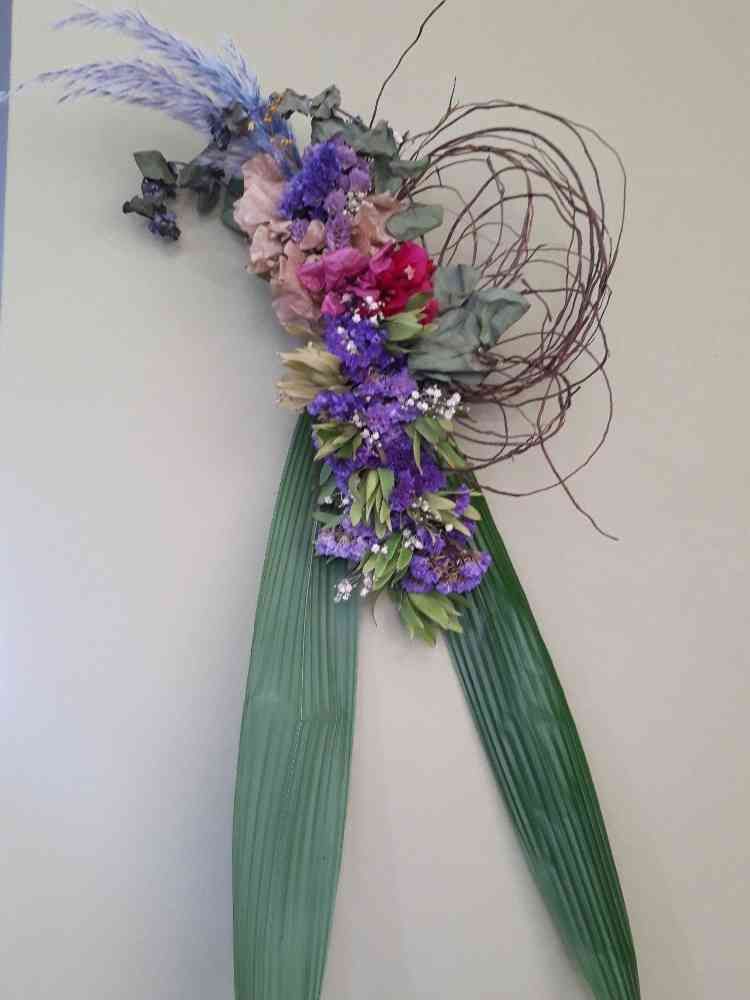 緑色の大きリーフに、パープルとピンクのお花主体のリースとてっもステキです💗