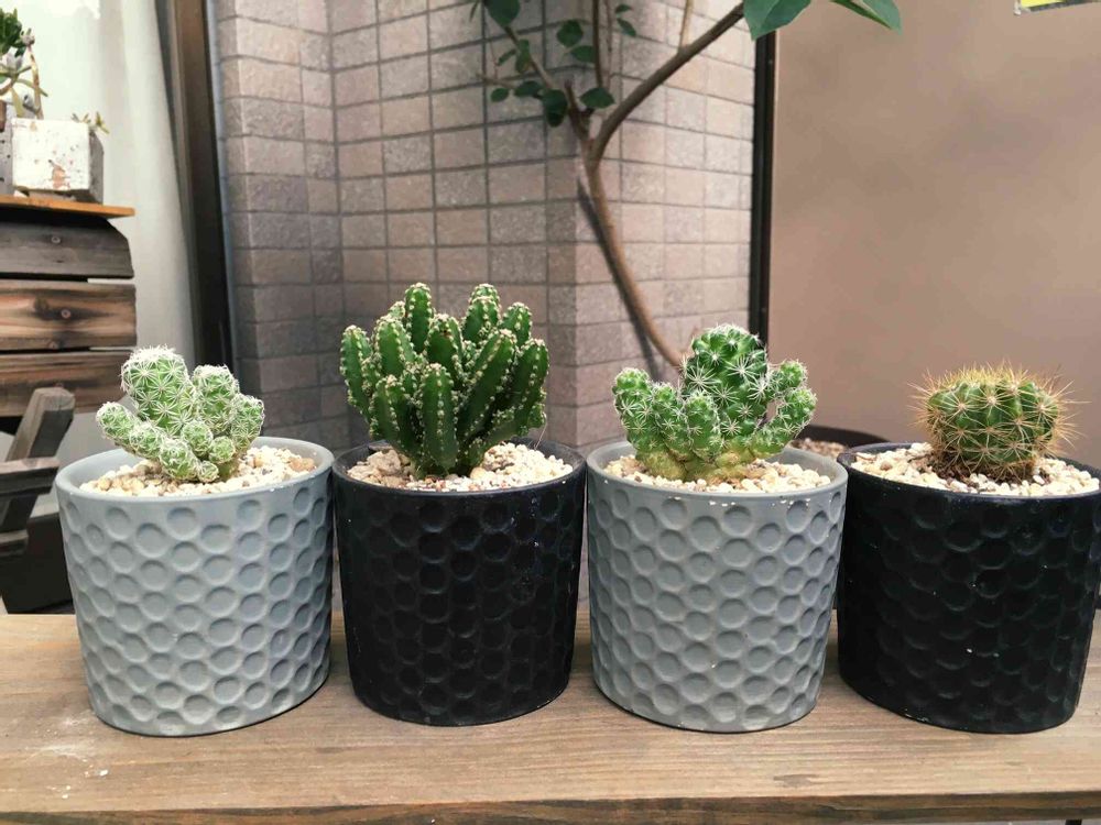 今日は暖かったので、100均のサボちゃん達をお揃いの鉢に植え替えました😊