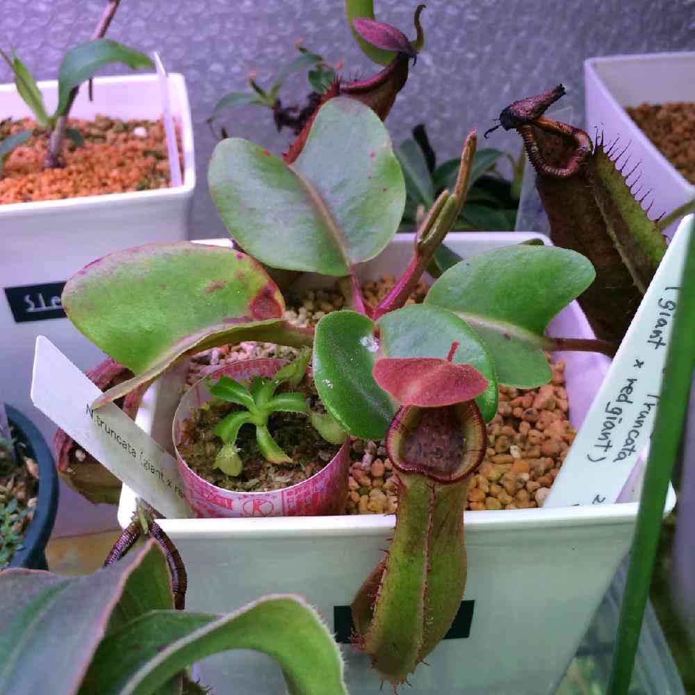 ネペンテス・トランカータ。ヤクルトに入った子供と、少し大人の階段登り始めたサイズの子。もっともっともーっと大きくなりますよ♪ 袋30cmにはなるはず!まだまだ先だけど…(ー ー;)