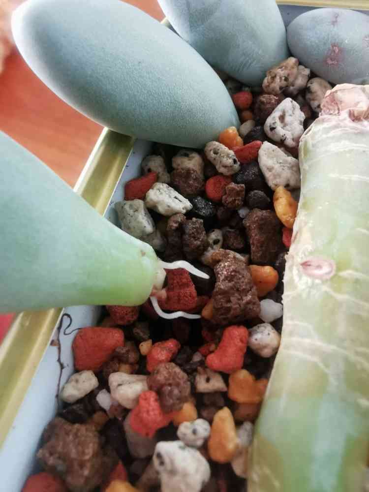 持ち上げてみると根が出ています。ブルーヘイズの葉刺しの成功率はやっぱり高いなあ。