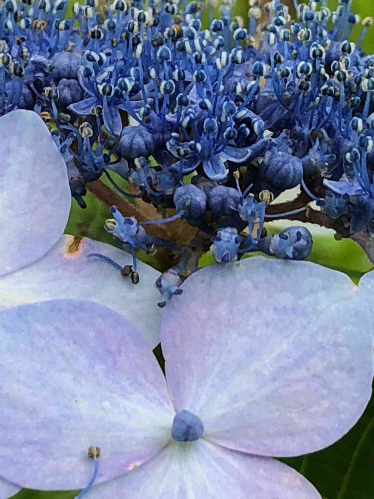 白いガクアジサイの、紺色のつぼみが弾けて、可愛い💕シベがツンツン飛び出しています❗️
