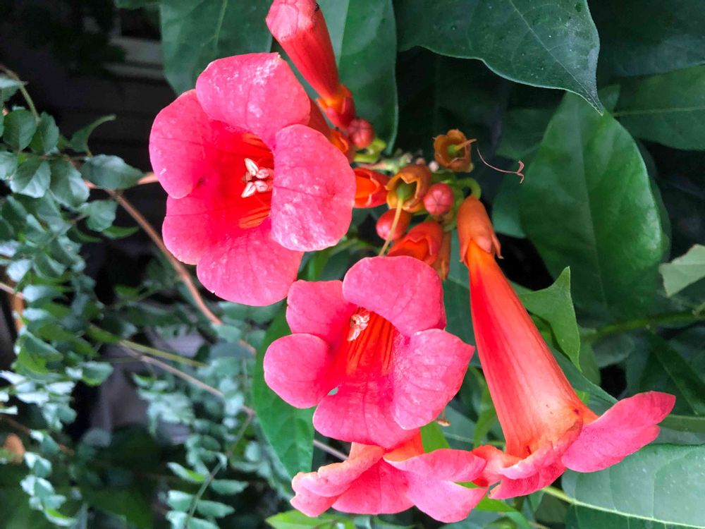 ノウゼンカズラカナ?花色は、オレンジ色・赤・黄色・濃い紅色 が有ります🤗 原産地は中国ですが、ピンクノウゼンカズラは南アフリカが原産地です🎵ノウゼンカズラはノウゼンカズラ科ノウゼンカズラ属の花🌼ピンクノウゼンカズラはノウゼンカズラ科