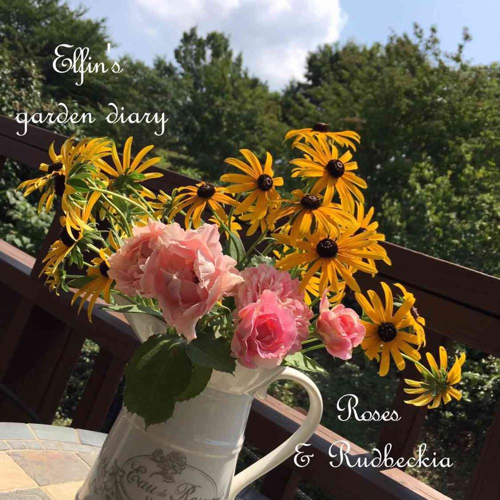 そろそろバラが夏バテ気味なので、花をカットして体力温存。一緒に生けたのは、庭で1番咲いているルドベキア。