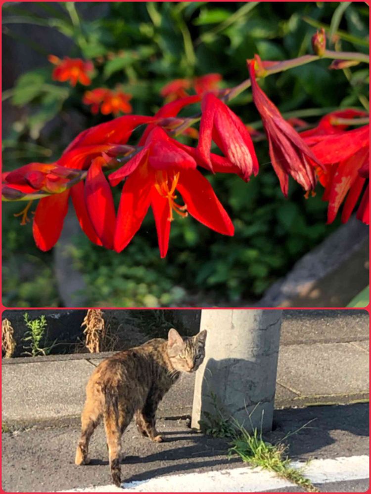 厳しいお顔の茶トラ猫さんに、赤いモントブレチアが無事に夏を越せるようにとエールを送っているようです❣️