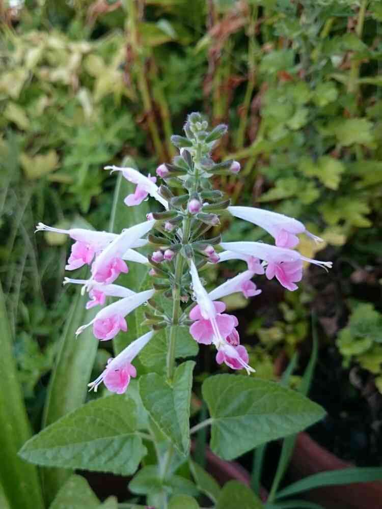 溢れ種で毎年咲いてくれるサルビアコクネシア コーラルピンク。この時期は薄い涼しげなピンク色だけど気温が下がると深みが増してコーラルに。