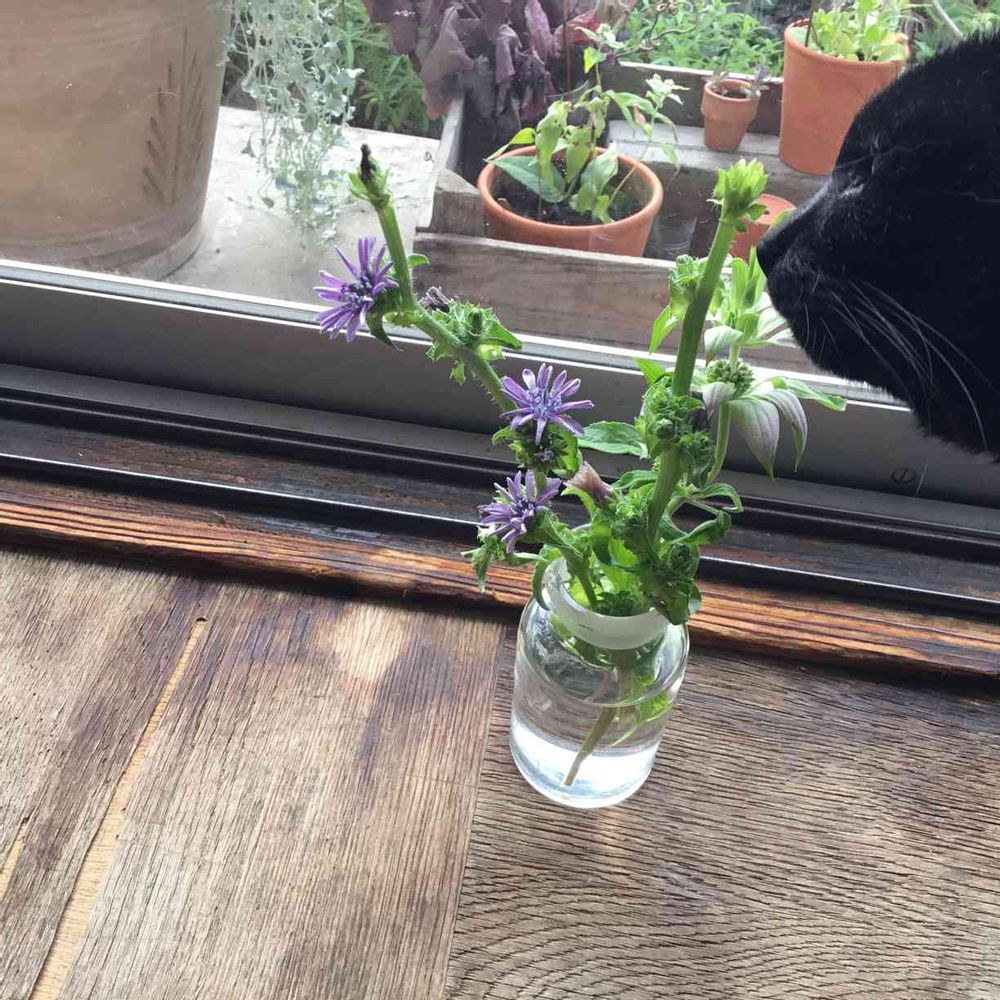 レタス系(エンダイブか何か)の野菜の花がものすごくかわいい😍けど、一日花ですぐ萎むからなかなか愛でられないなぁ、と思っていましたが少し切ってきたらつぼみが家の中でもちゃんと開いてステキな紫色をじっくり眺められています。