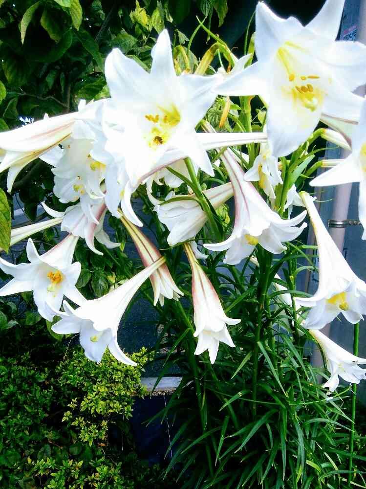 マンションの一隅の見事な白百合。当然ミツバチさんにも大人気。カサブランカで良いんでしょうか?💞
