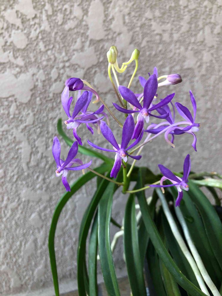 フウラン、と言って苗をいただきましたが、葉っぱの感じが白い花の咲くフウランとちょっと違う、と感じていました。バンダとの交配種だからなんでしょうね。