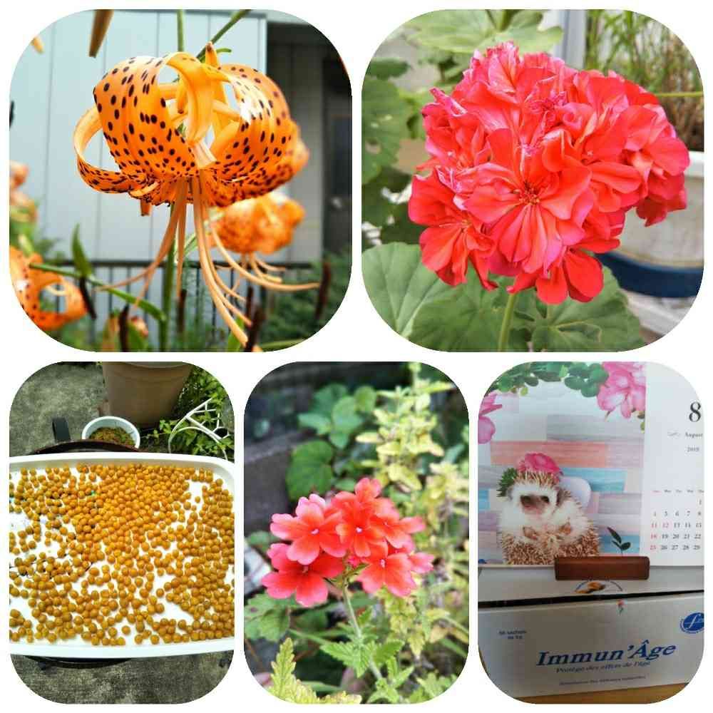 オニユリ、ゼラニューム八重、ガーベラ+ハリちゃんのカレンダー📅ももう8月