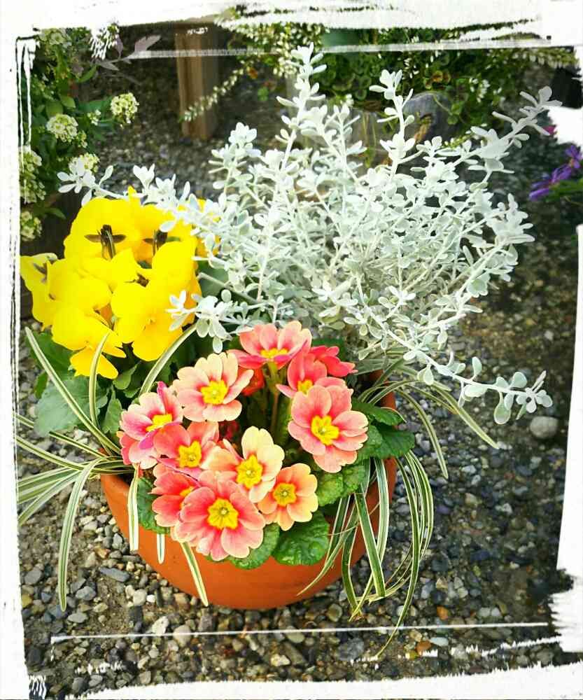 コロンとした小さくて可愛い💠鉢に入っています。ビタミンカラーでcuteな寄せ植えです。