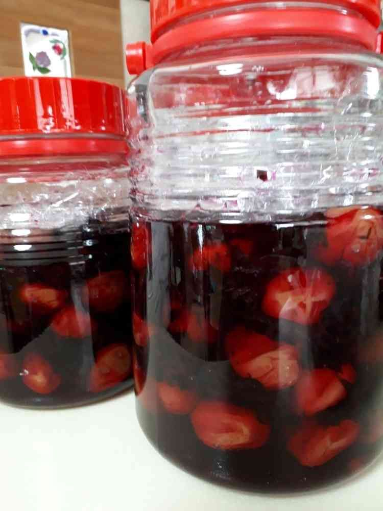 土用干しした梅を赤紫蘇・氷砂糖・酢に漬け込みました。色がきれいに染まり、落ち着いたら(甘梅干し)の出来上がり。さてさて、上手く出来るかしら💦