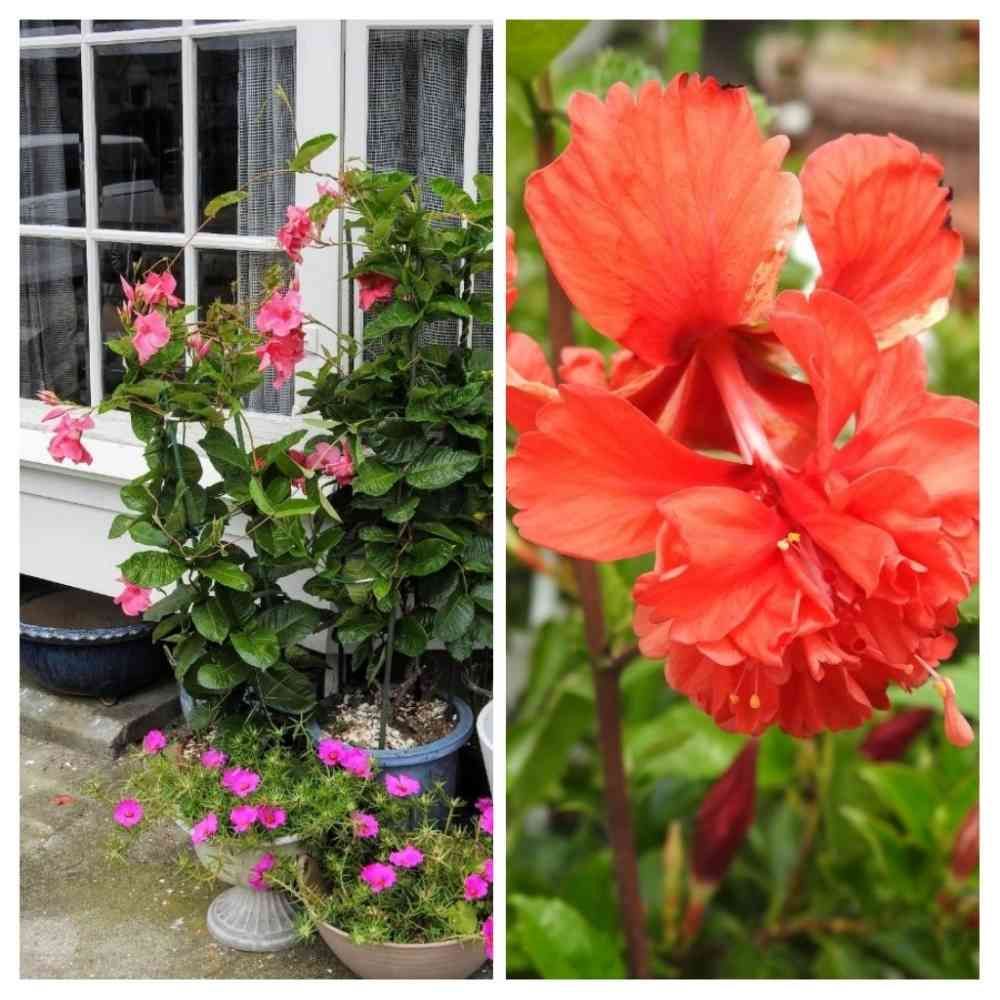 喫茶店☕🏠の入口で咲き誇っている❗🌸マンデビラと🏵️ブッソウゲの花🌸🏵️