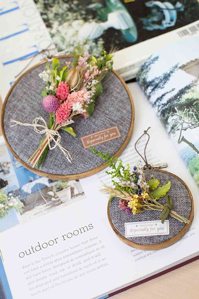刺繍枠を使ってドライフラワーを自分好みでアレンジしていきます。