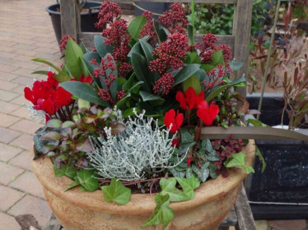 シキミア ルベラ、シクラメンをメインにした寄せ植えです。
