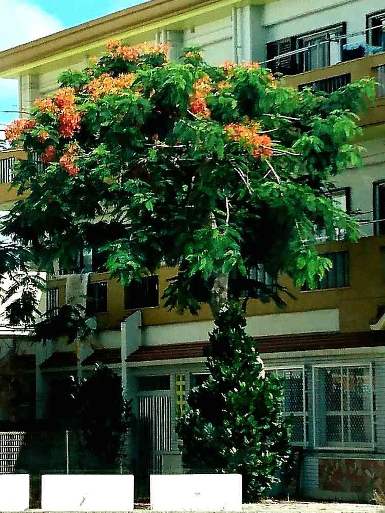 ホウオウボクは、街路樹として植えられている熱帯性落葉高木で、初夏から秋にかけて、鮮やかな赤い花を咲かせます。