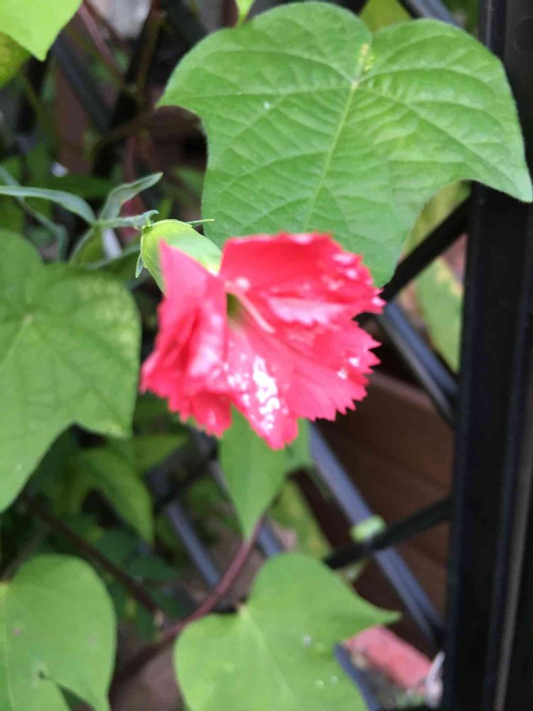 朝顔の葉っぱの間から可愛いカーネーションが咲いてました😅💕