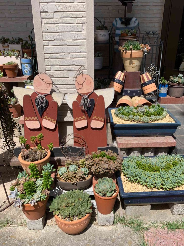 我が家の玄関口に飾ってある手作り天使と植木鉢で作った人形そして可愛い多肉植物達です!
