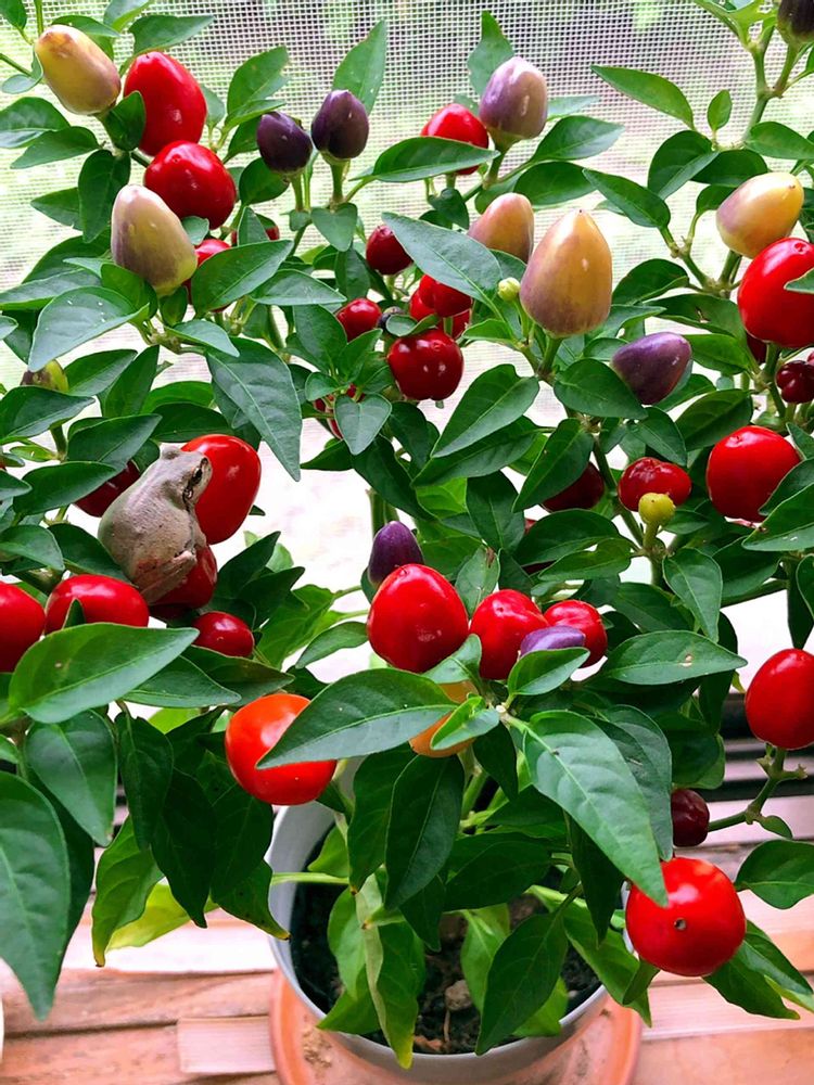 ゴシキトウガラシ、カラフルでかわいいですね。カエルさんも馴染んでますね。居心地がよさそう♡♡♡わたしは父を2年前に。今は姉妹で実家の水ややり草引きが大変です😉