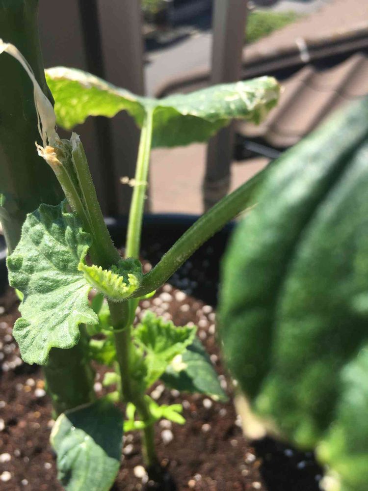 強風で折れてしまったきゅうりに新たな芽が出てきました。頑張れ〜!