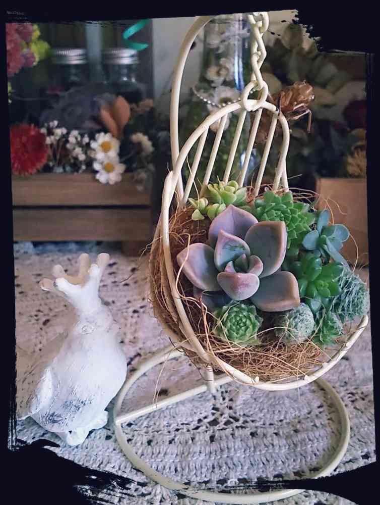 ハンギングチェア、我が家の鳥王子のだったのに、いつの間にか多肉さんの椅子に~💦