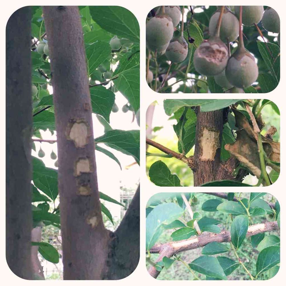 風で枝が擦れたにしては変な位置だし今までこんなのになった事が無いので誰の仕業なのか😭❓実は食べてもいいけど幹齧らないで💦💦💦