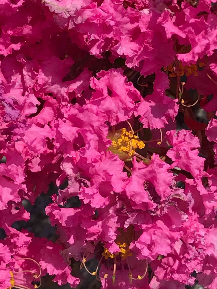 出かけた先でも、近所でも、暑苦しく花盛り・・・サルスベリ(百日紅)です。歩道沿いに植えられた、胸の高さの生垣なので、園芸品種だと思います。