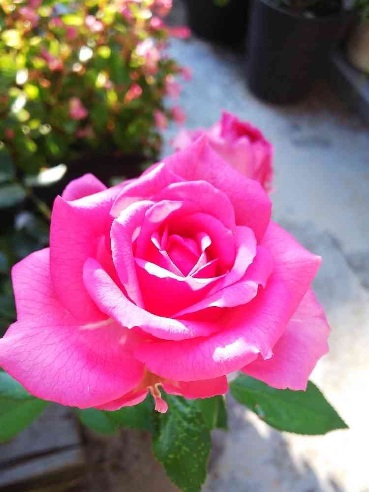 ベランダで暑さにめげず、🌹レジスマルコン🌹が咲いてます。