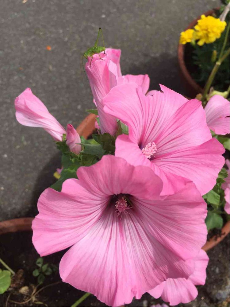 旅先の道の駅にて見つけた綺麗なピンク色の花。よく見るとバッタ?キリギリス?が止まっています(╹◡╹)