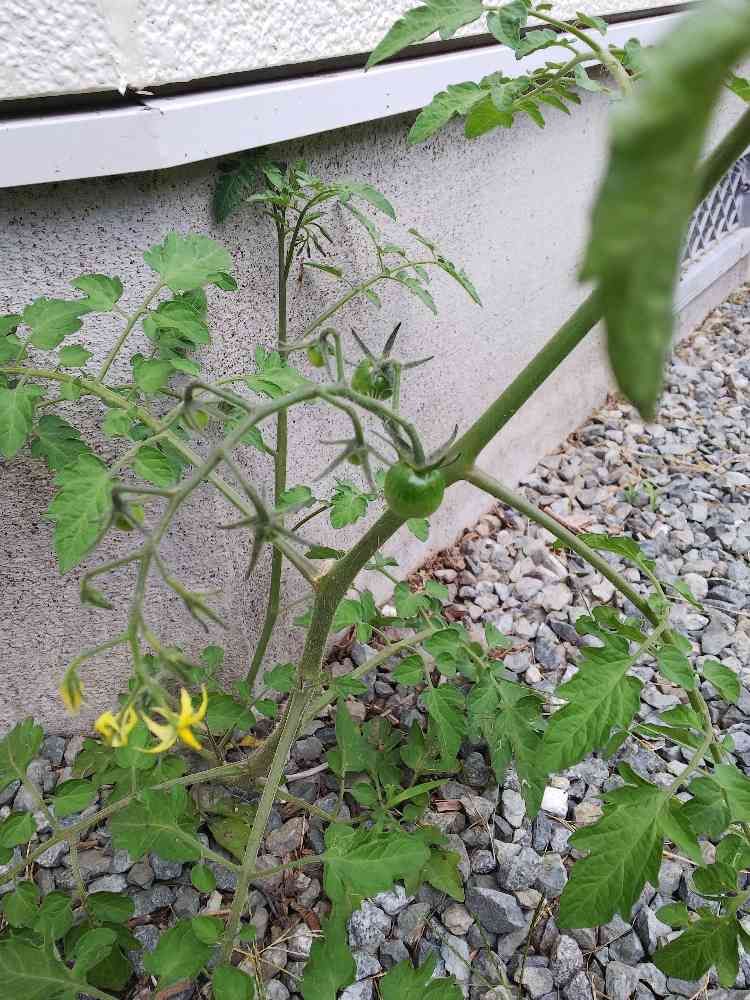 変な所から(後ろは🏠️)生えてきたミニトマト🍅健気なのでそのままにしていたら、いつの間にか実がなってた🤭