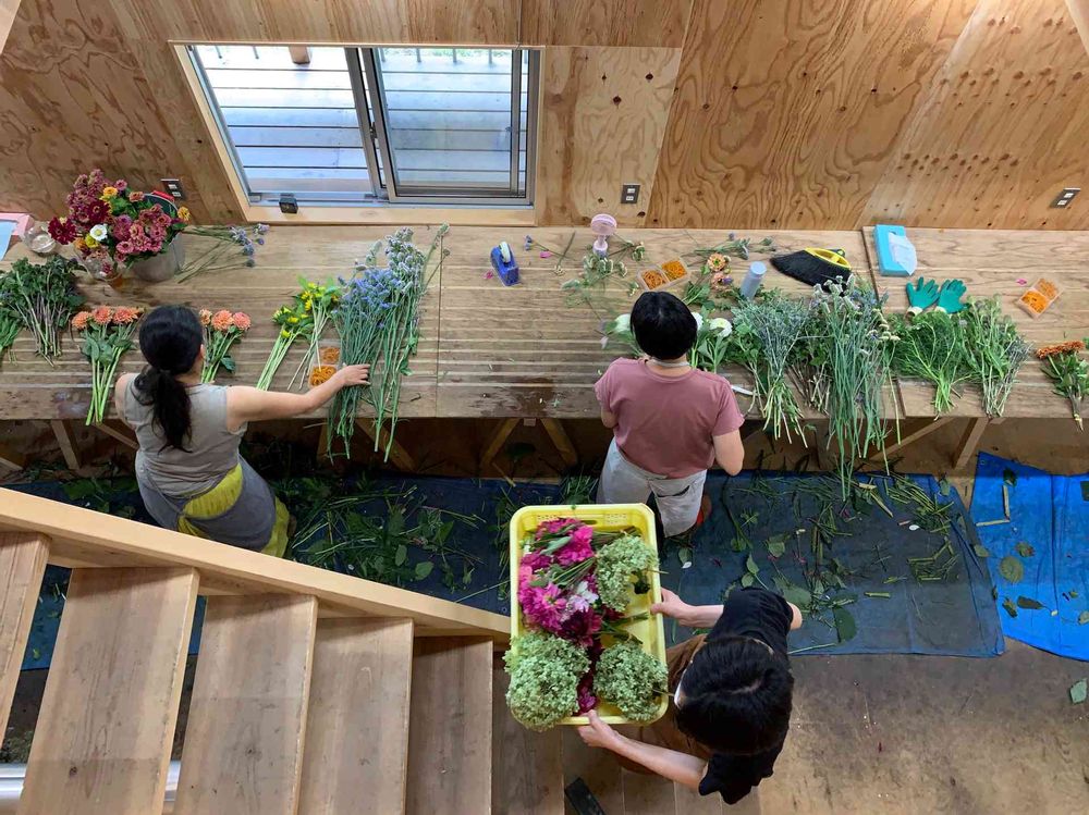 八ヶ岳の麓にあるフラワーアレンジメントのお店ーflowers for Renaでは、次々とアレンジメントや、ドライフラワーようの花束が作られてます