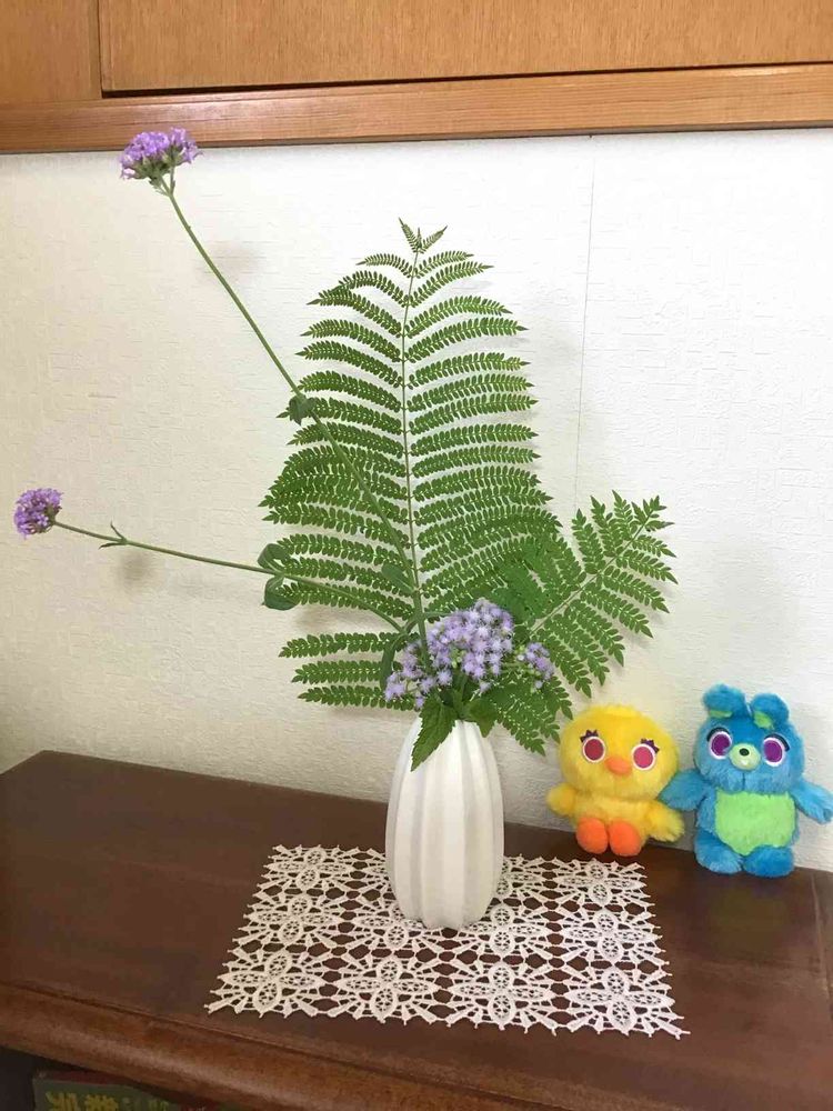 分からないので、最近 このマスコットを ちょこんと置いて、その日 朝、摘んだ花🌸を 生けて picを 撮ったものを