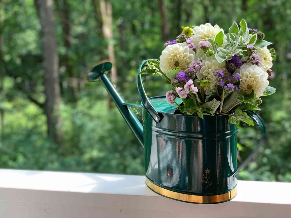 ちょうどいい花瓶がないので、カインズホームで買ったじょうろに、八ヶ岳の麓にあるfliwers for Renaさんのブーケを入れたらちょっといい感じになりました