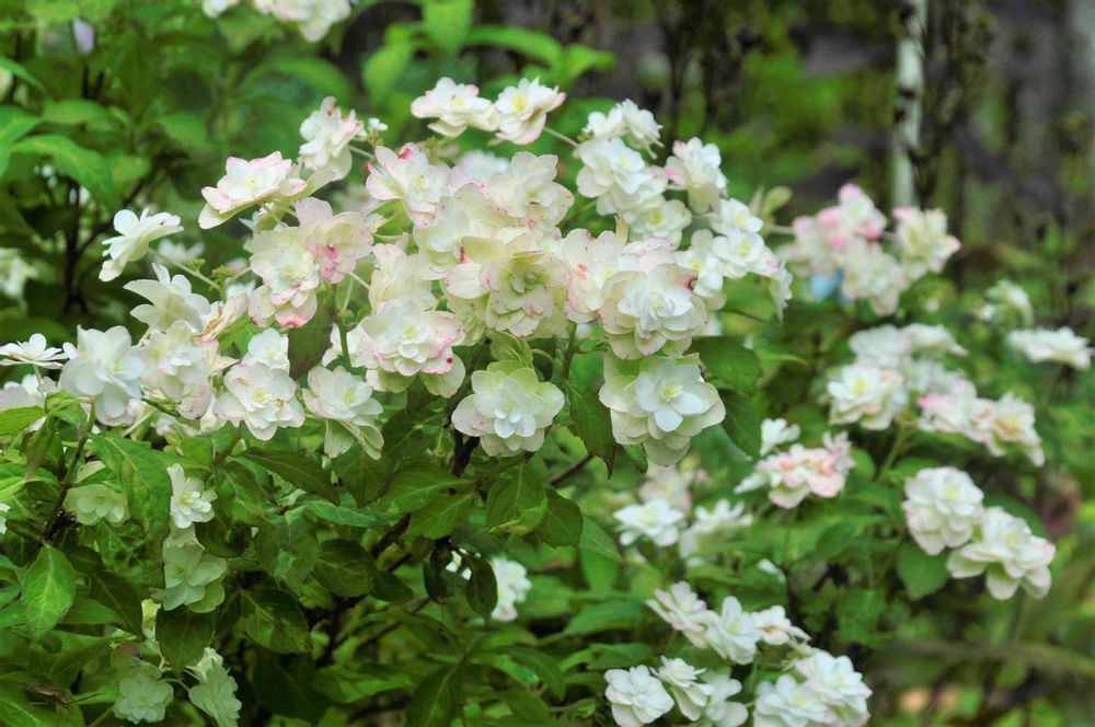 ヤマアジサイ白に薄いピンクが混ざる感じで多分富士の滝だったように記憶します。最近まで真っ白だったのですが今日見たらピンクが混ざりだしました。