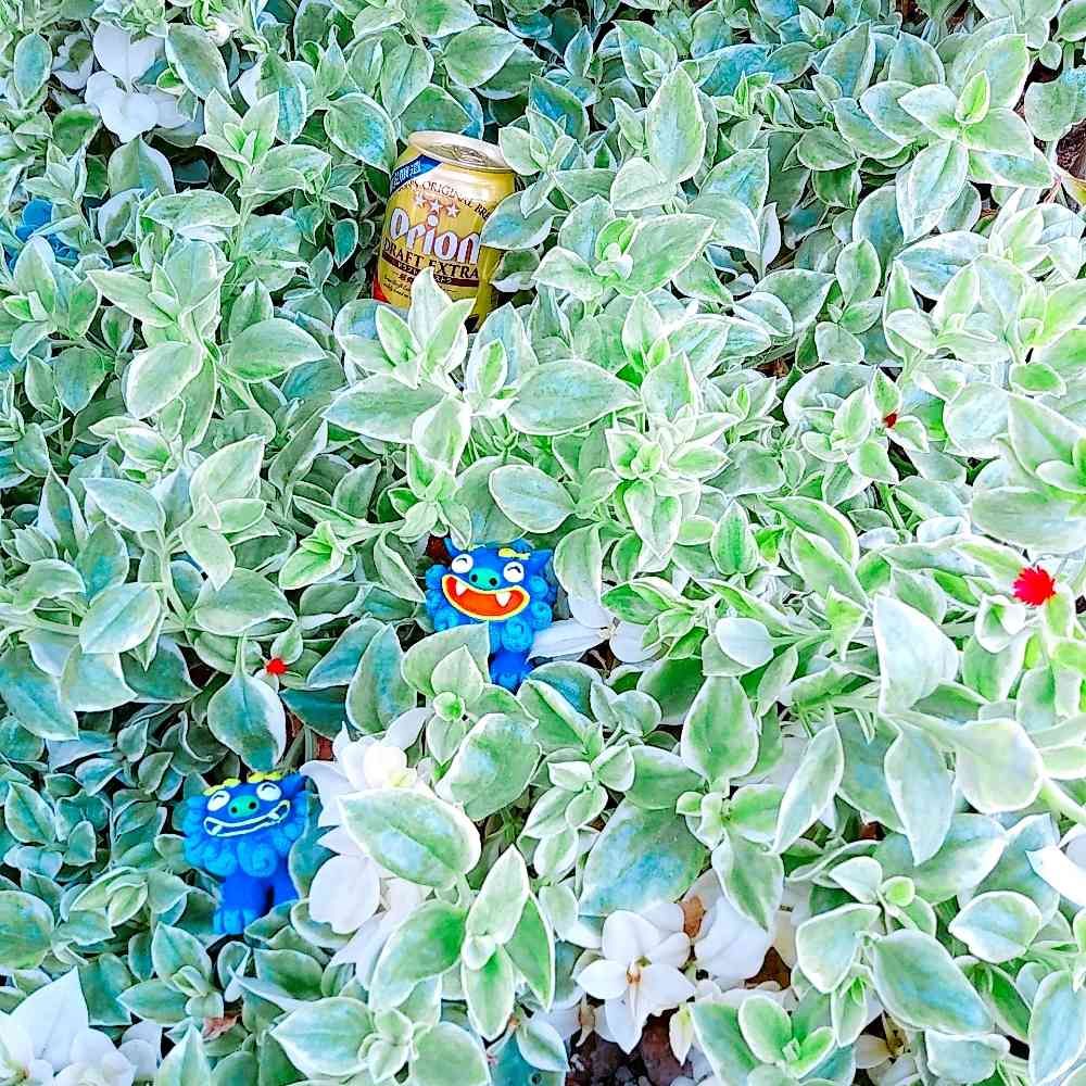 大きく広がった斑入りベビーサンローズの中のシーサーがとても楽しそうで