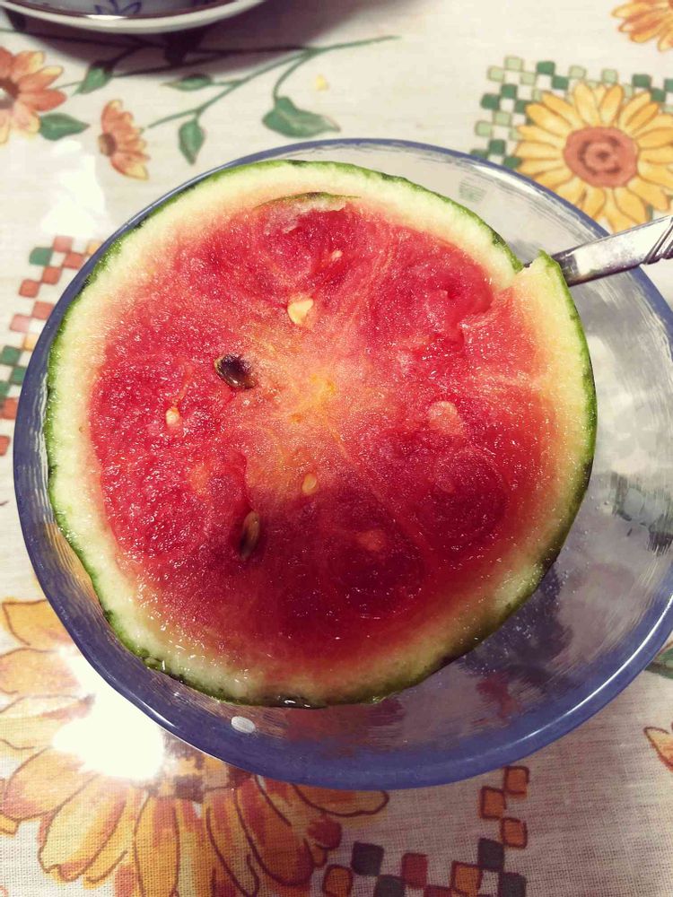 8/12(月)おはよーございます^_^曇ってます、さっき霧雨が降っていました。小玉スイカ🍉3個目、皮に茶色のコゲみたいのが出来ていたので収穫!ナイフを当てたら割れました〜。う〜ん、少し遅いかなぁでも水分たっぷり🤔😄