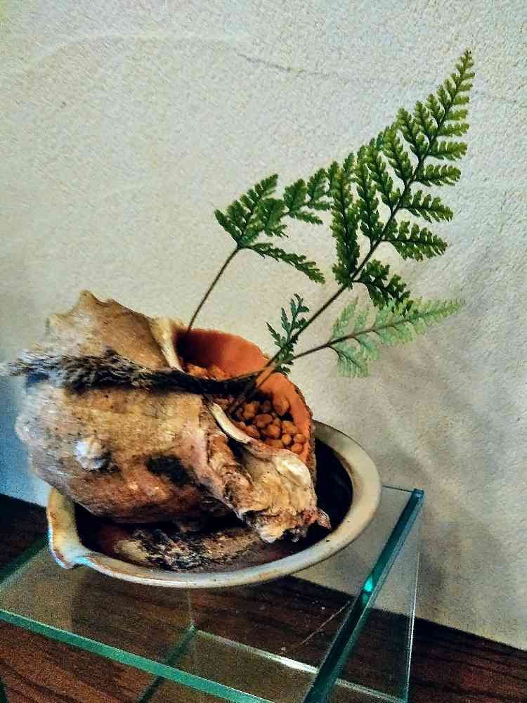 軒の忍ぶを一本はがしてきて、中身を食べたサザエの貝殻と、鹿沼土と、ありものでいたずらしてみました。鹿沼土は売ってるものです。先日泊まったホテルで素敵だったので真似っこです。涼しそうにできました。