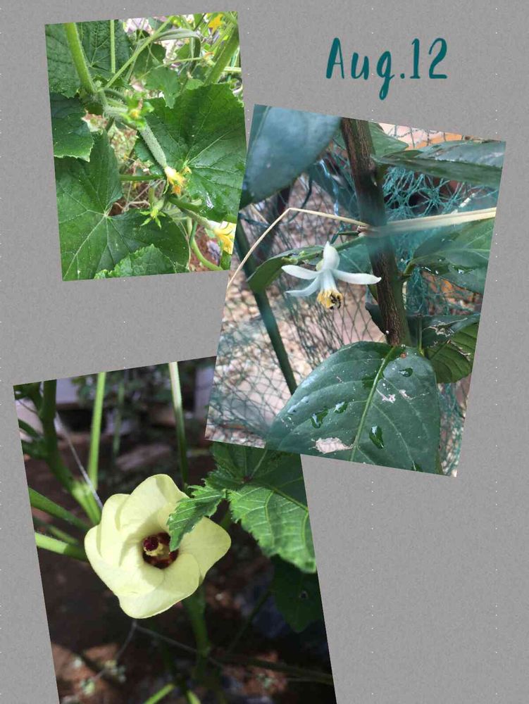 待望の?オクラはデカイキュウリの葉陰にもかかわらずやっと小さく開花。😹