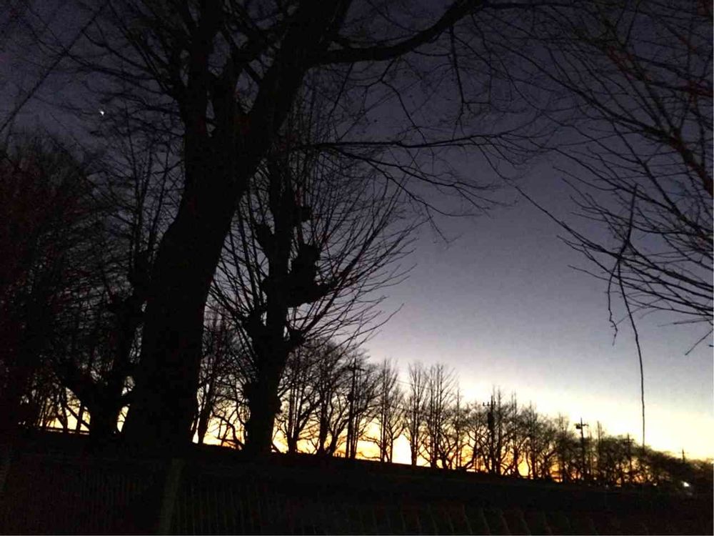 一番星が光っています🌟ベランダから見えるのは桜並木🌸冬のこんな光景もいいなぁ。