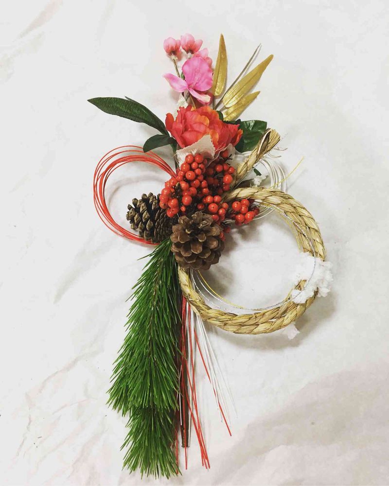 子供が幼稚園で作って来たしめ縄に松ぼっくり、松、南天、紅白水引と100均の造花を足してしめ縄作ってみたよ。楽しい!