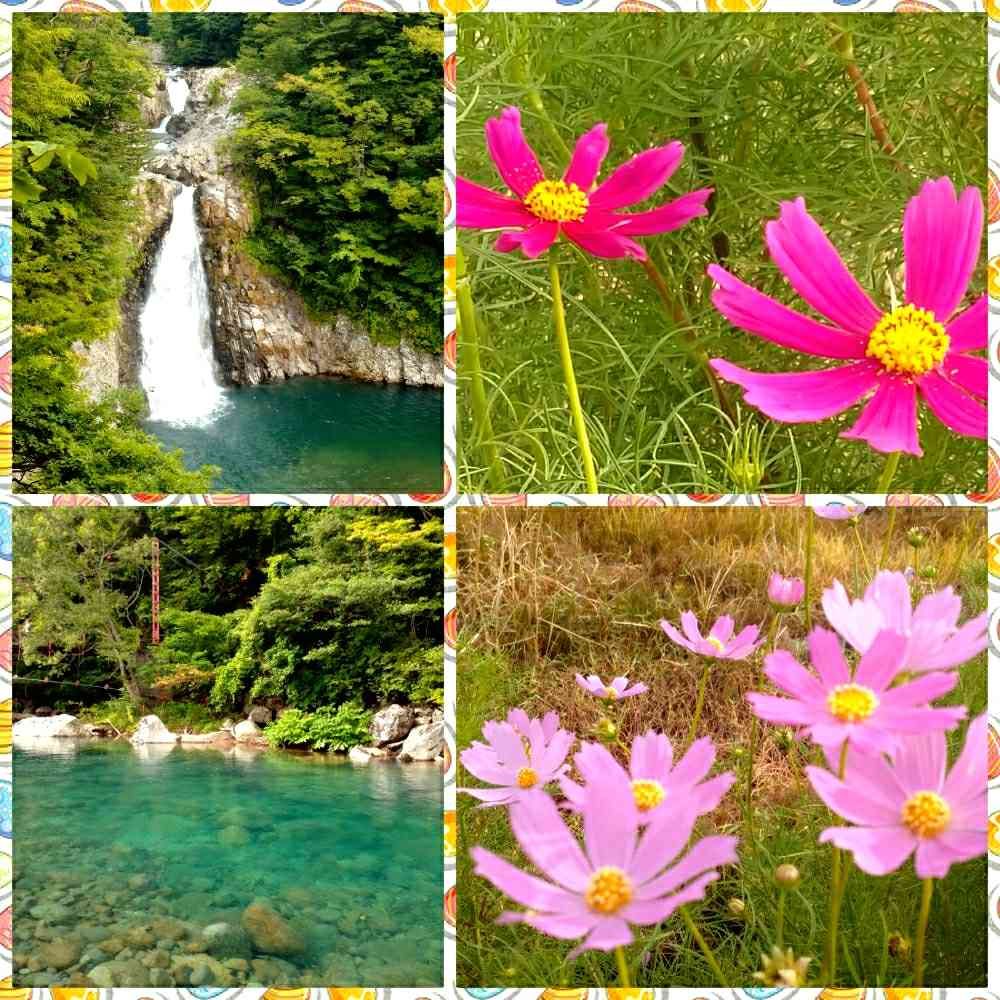 日本の滝百選の1つです。滝の美しさと水の透明度に感動しました😆。途中の道端の秋桜🌼が、秋を感じさせてくれます。